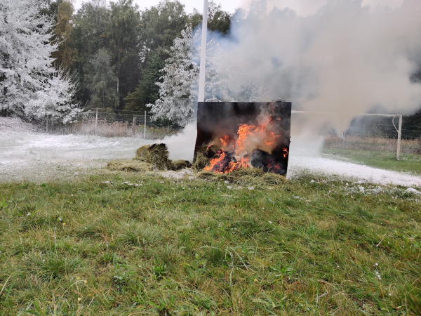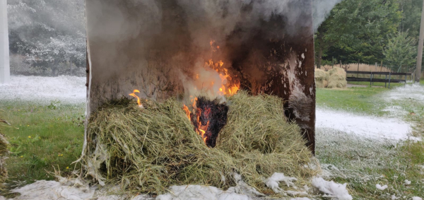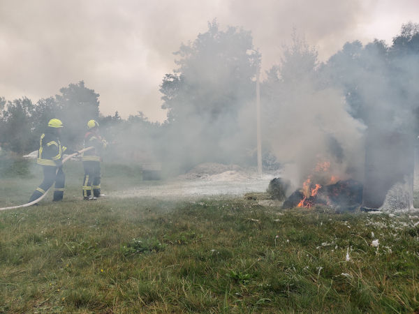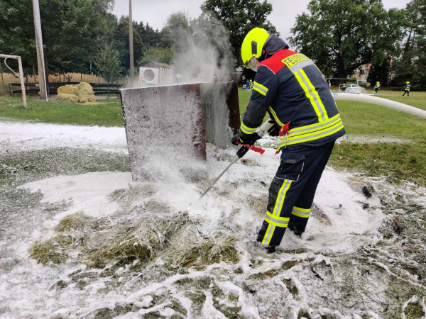 Unsere Bad Muskauer Kameraden führte an Station 2 eine umfassende Schulung an der Druckluftschaumanlage des TLF 4000 durch. Nach Erläuterung der Besonderheiten des Löschmittels und der technisch/physikalischen Eigenarten des Verfahrens zur Schaumerzeugung ging es auch an dieser Station schnell in die Einsatzpraxis. Der erste große Aha-Effekt stellte sich bereits beim ersten Öffnen des Schaumrohres ein. Durch den sich schlagartig abbauenden Druck des Löschmittels ist das Strahlrohr in diesem Moment nur schwer und mit viel Kraft zu beherrschen. Nach Verinnerlichung der Strahlrohrhandhabung ging es an die Brandbekämpfung. Es wurde zunächst die Umgebung eingeschäumt um eine Brandausbreitung zu verhindern. Im Anschluss wurde dann der Brand mehrer Strohballen bekämpft. Hier zeigte insbesondere die neu beschaffte Löschlanze ihre Vorzüge. Sie ermöglichte das effektive Löschen versteckter Brandnester. Der rasche Löscheffekt wurde von den, durch den Rauch angelockten, Zuschauern staunend beobachtet.